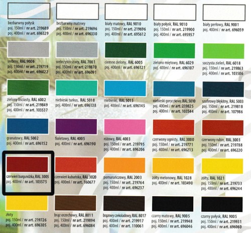 Jest odporny na działanie czynników atmosferycznych i promieni UV, można go stosować zarówno wewnątrz, jak i na zewnątrz pomieszczeń. Idealnie kryje malowaną powierzchnię, 100% powtarzalności koloru - według tabeli RAL.