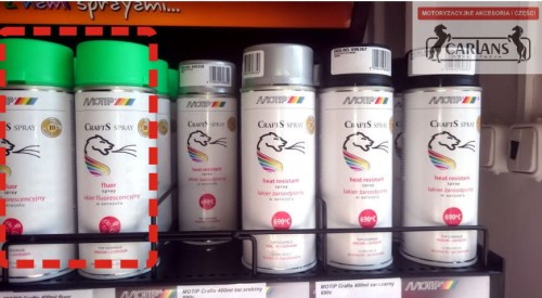 Lakier fluorescencyjny Motip jest na bazie akrylu, nasycony pigmentami fluorescencyjnymi. W celu uzyskania optymalnego efektu zaleca się uprzednio pomalować białym lub ż