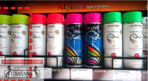 Lakier fluorescencyjny Motip jest na bazie akrylu, nasycony pigmentami fluorescencyjnymi. W celu uzyskania optymalnego efektu zaleca się uprzednio pomalować białym lub ż